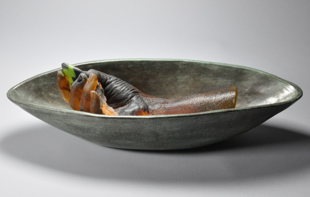 Glazed stoneware with cast glass hand