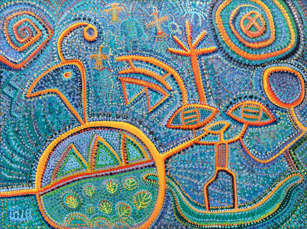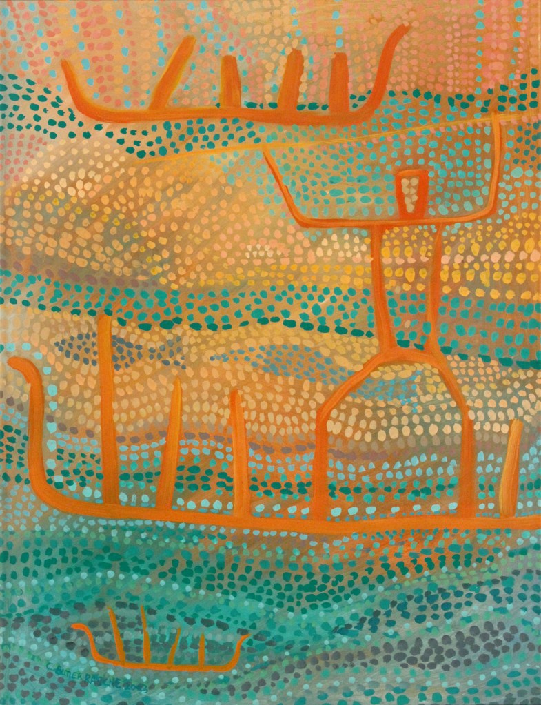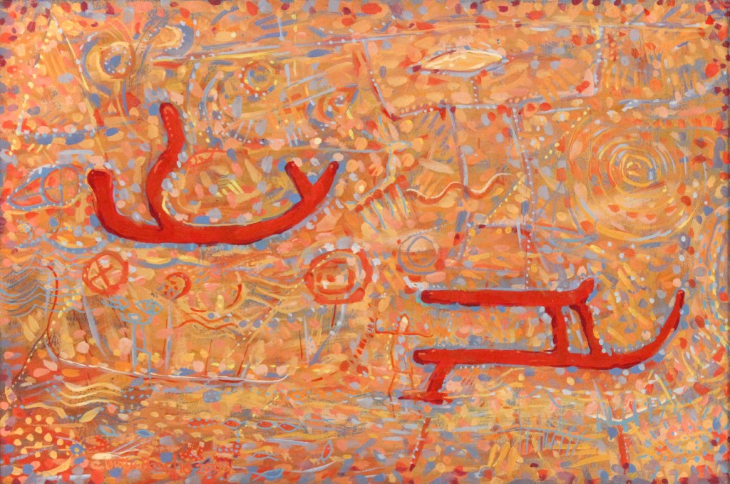 These paintings, drawings and relief sculptures reflect both ancient and contemporary symbols used in a contemporary manner.